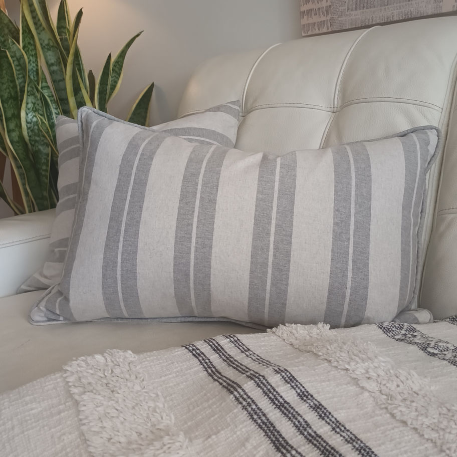 Naturally beautiful striped fabric throw pillow in light grey and white. Eco-friendly. This recycled cotton fabric has a soft grainy feel to resemble a linen texture. Piping is made of the same fabric. Stripes run in a vertical pattern and pairs great with the Panama pillow.