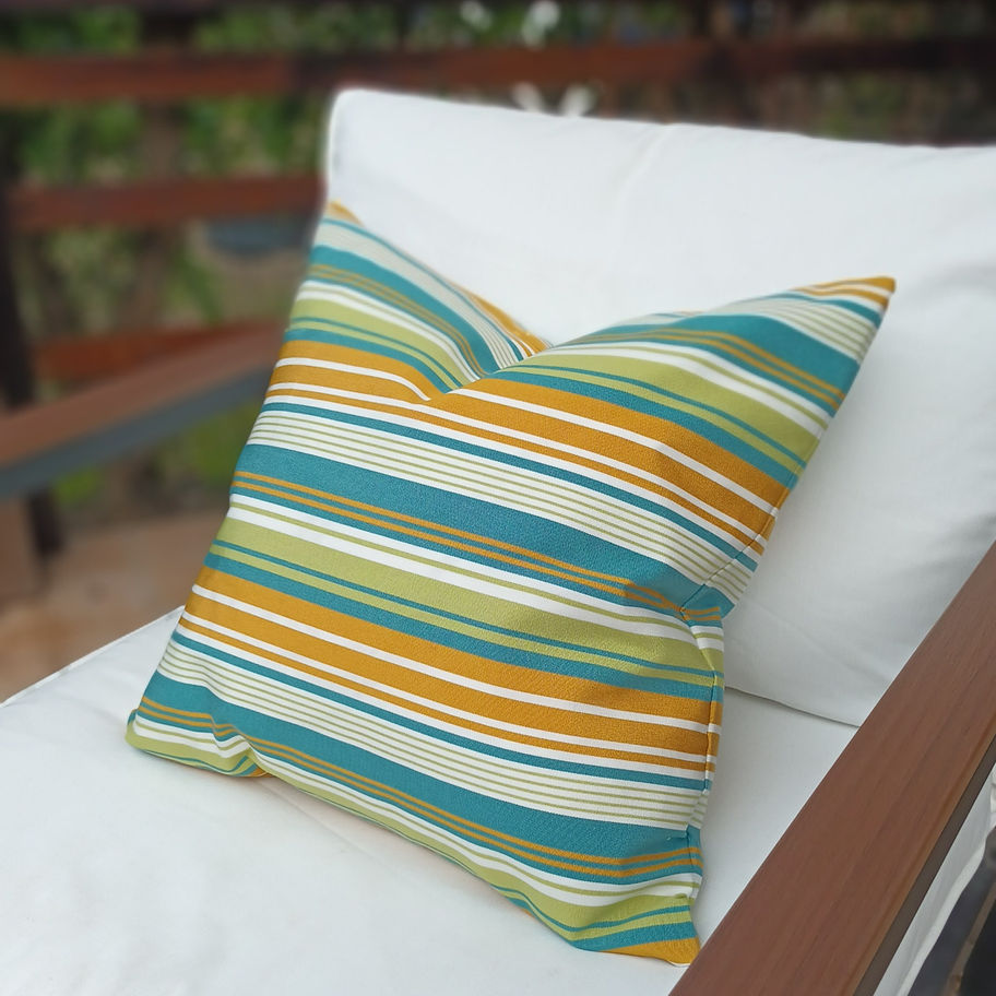 A beautiful outdoor striped fabric throw pillow in blue, green, orange, and white.