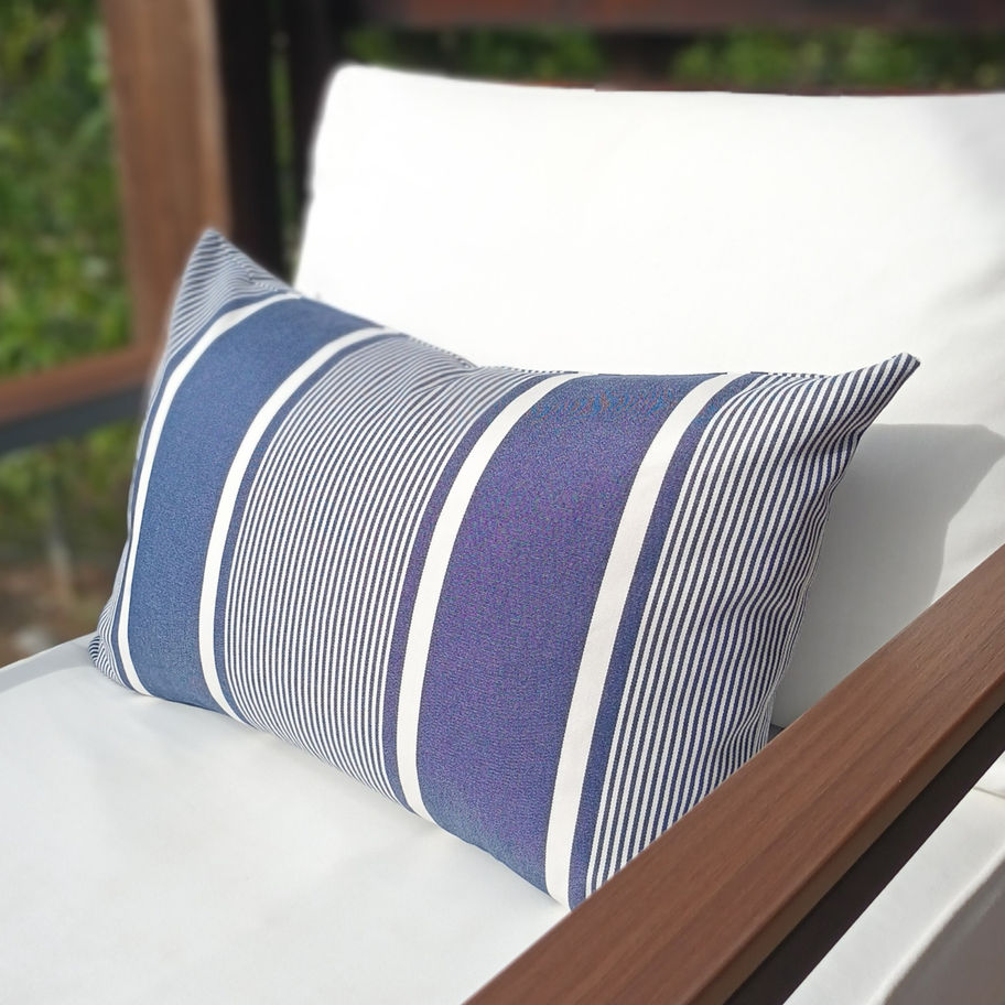 A beautiful outdoor striped fabric throw pillow in blue and white. This nautical style pillow can be a great adition to your outdoor space or perfect for adding a touch of color and sophistication to your yacht.